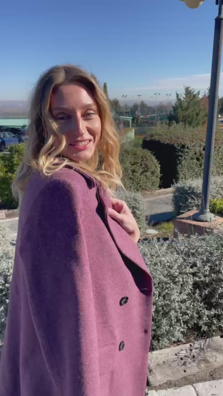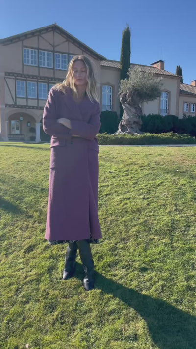 Men's coat, straight silhouette with structured shoulders, double-breasted, patch and flap pockets, satin lining, wide back vent.