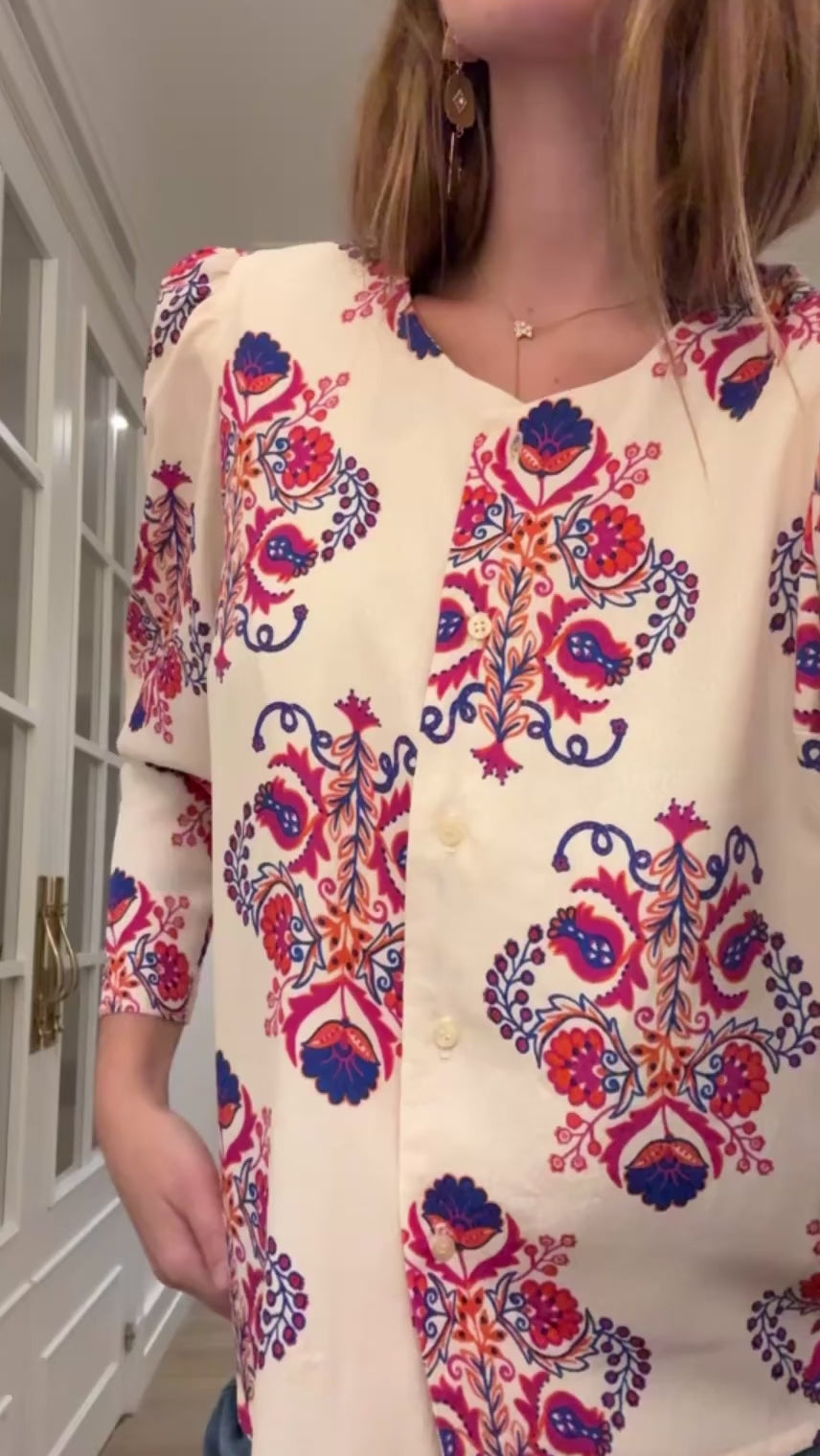 Bohemian blouse with a round neck, long, slightly puffed sleeves with elastic cuffs.