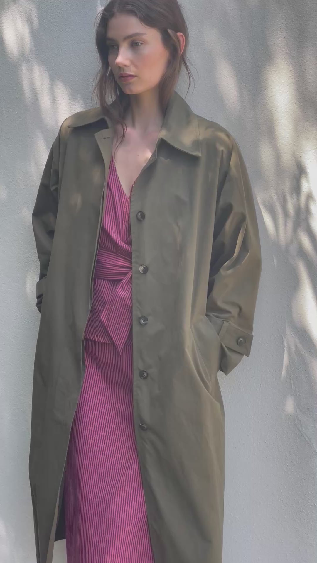 An oversized trench coat made from water-repellent technical fabric. A must-have for your transitional wardrobe.