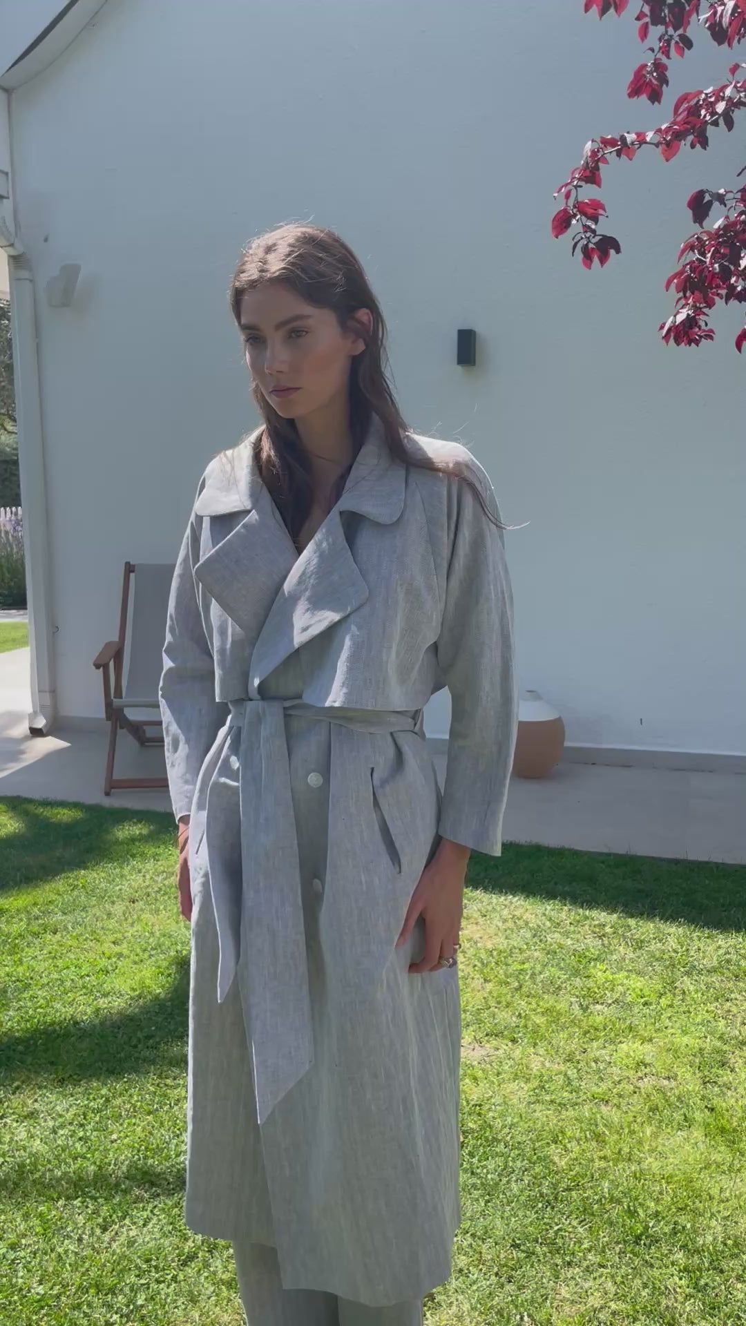 Perfect mid-season parka. Made from a crepe with blue herringbone on a white background. Flaps at the top, double-breasted closure, and belt.