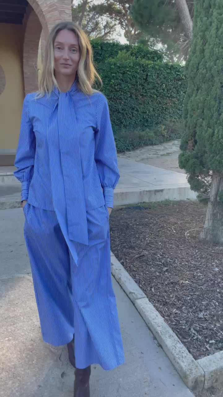 Camisa con cuello con lazo del mismo tejido. Manga larga acaba en puño con pliegues.
