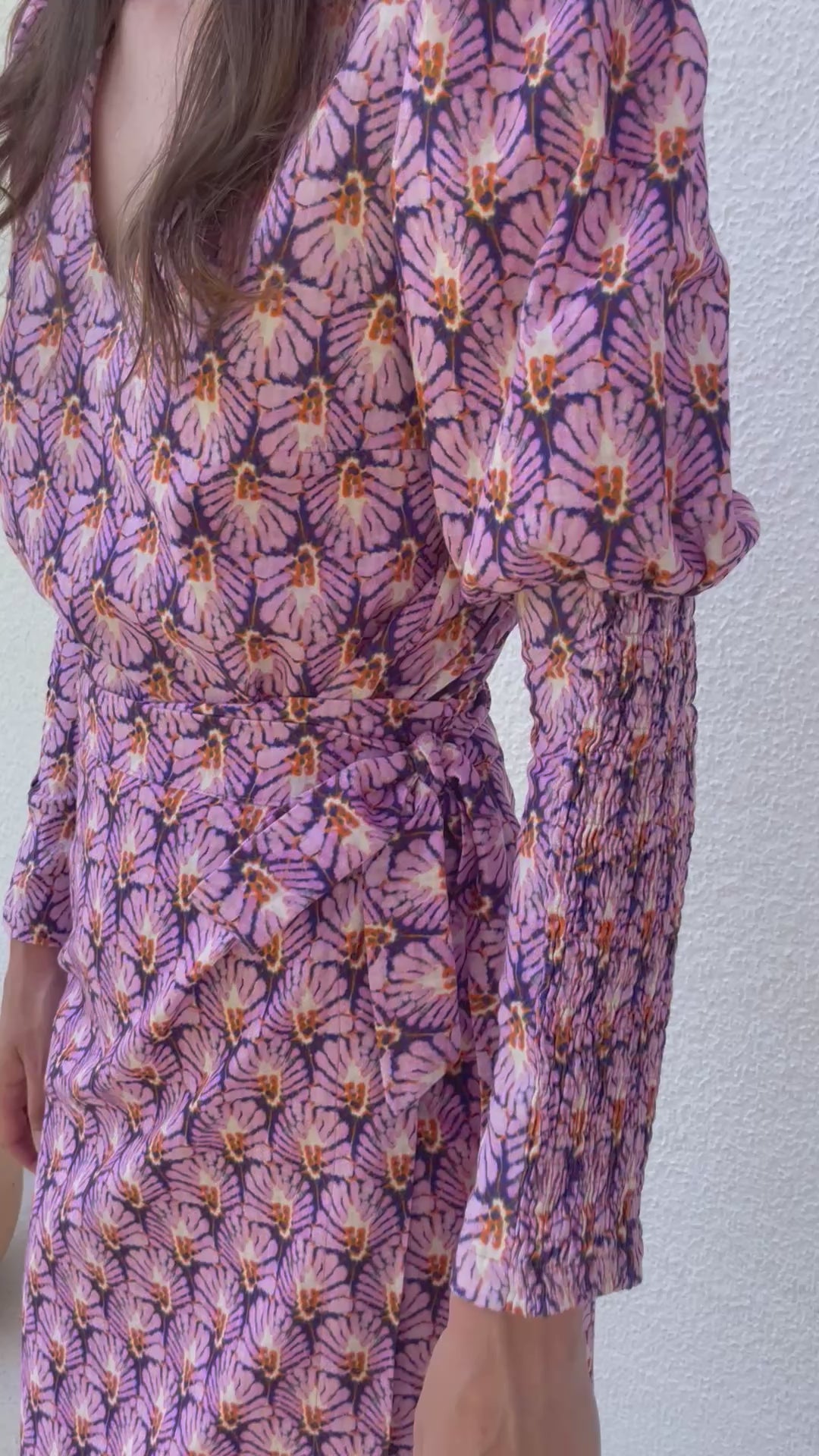 Blusa de escote pico con mangas largas abullonadas con puños largos de goma.