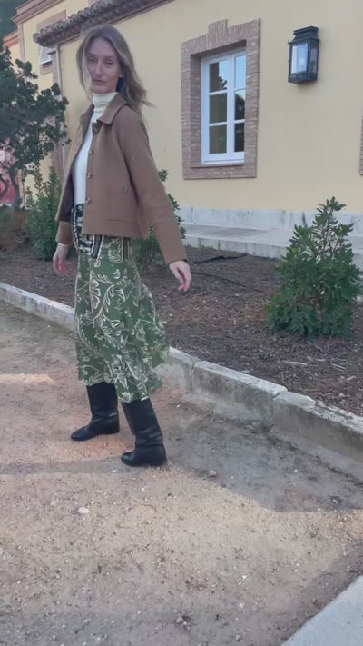 Falda fluida con detalle de francos en cadera. Cierre con cremallera invisible.