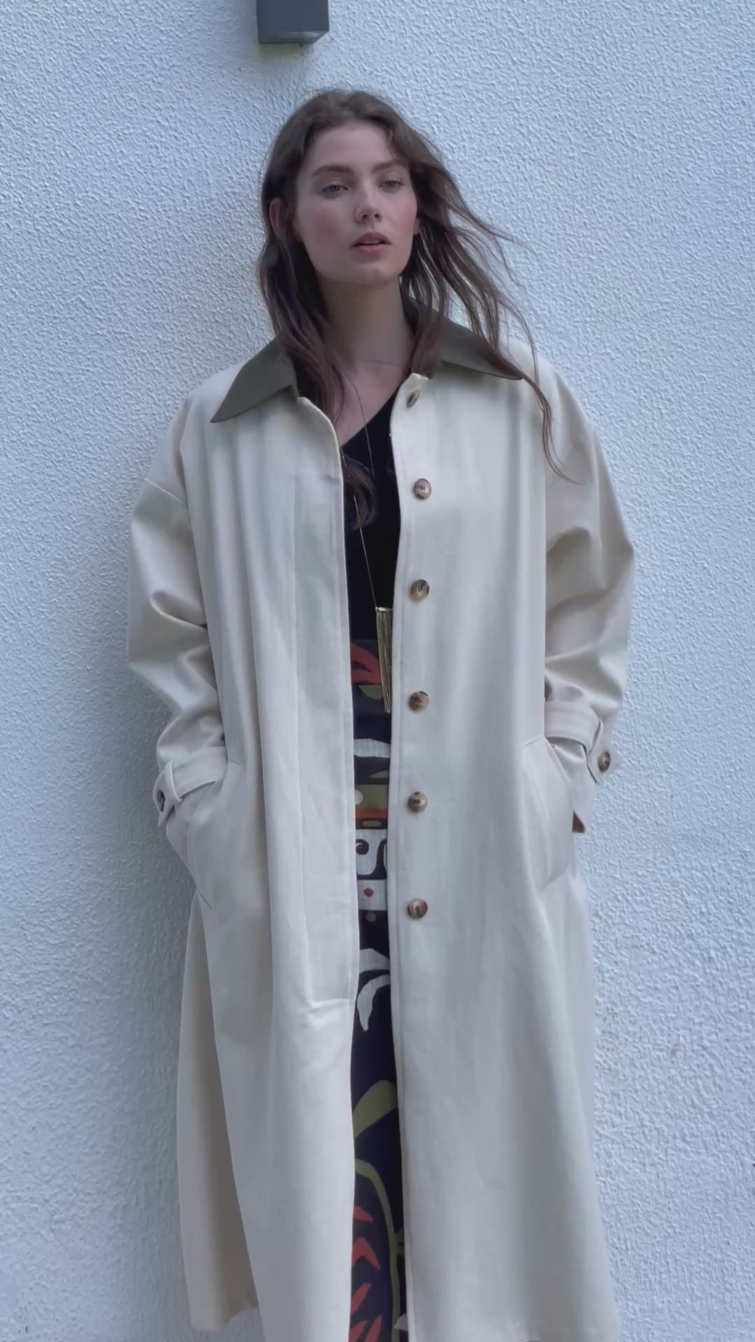 Trench de corte oversize, realizado en tejido loneta color blanco crudo con detalle de cuello verdes. Prenda imprescindible en tu armario de entretiempo.