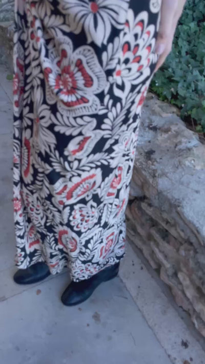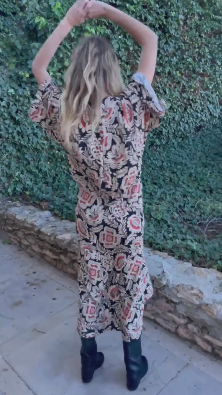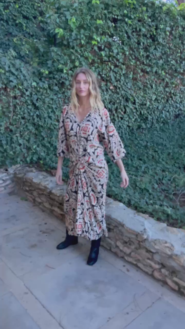 Vestido estilo caftán, drapeado en la zona de la cintura, escote pico y manga larga.