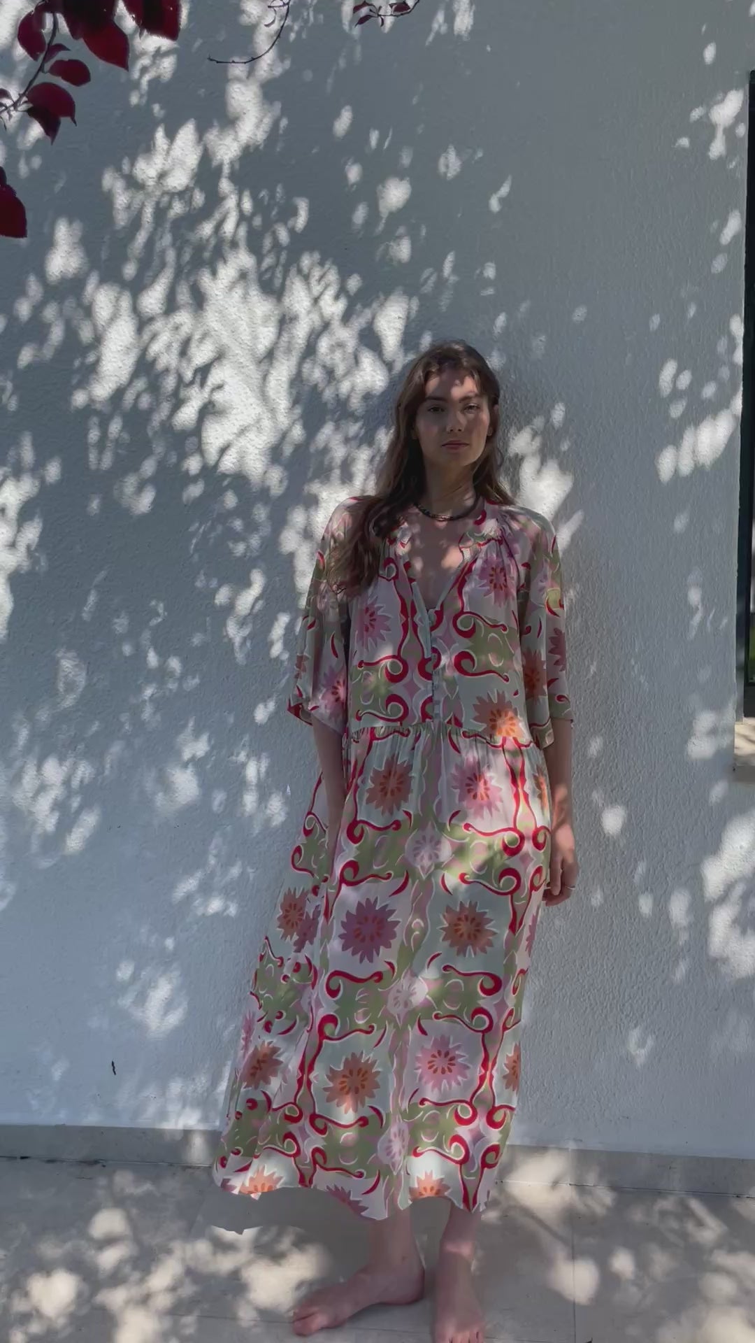 Vestido midi suelto, manga ancha aflautada tres cuartos. Escote pico. Abotonada en la parte de arriba. Realizado en estampado exclusivo motivos retro en un tejido de viscosa crepe.