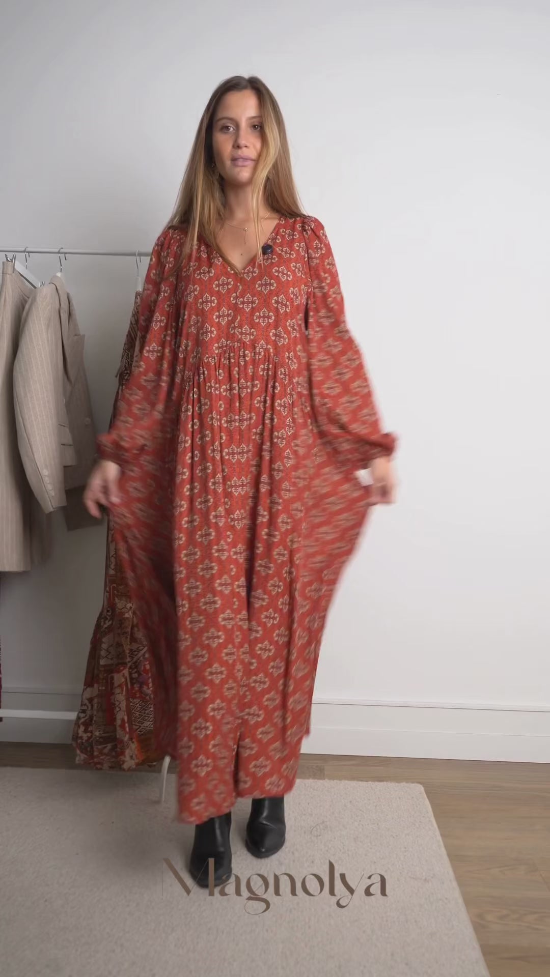 Vestido bohemio maxi, escote pico, manga larga amplia con puño elástico.