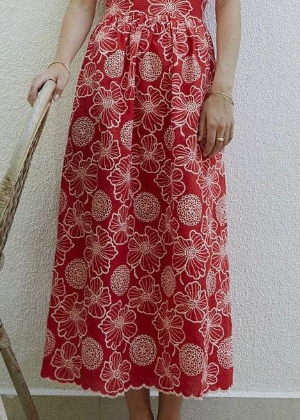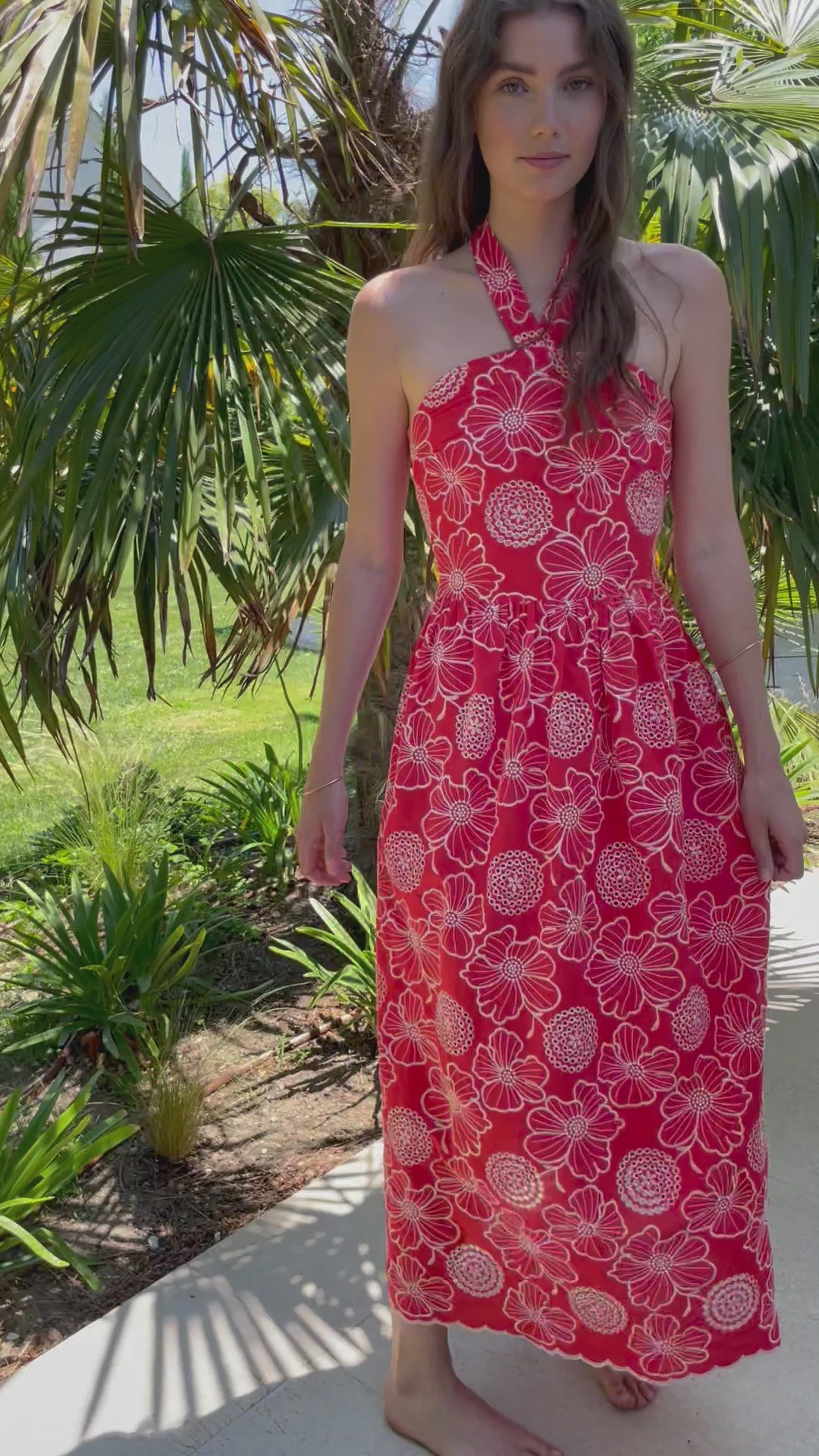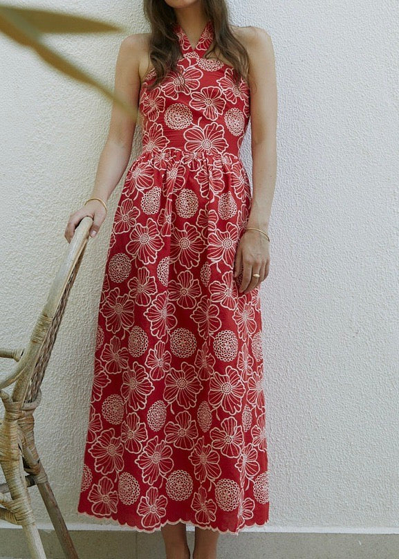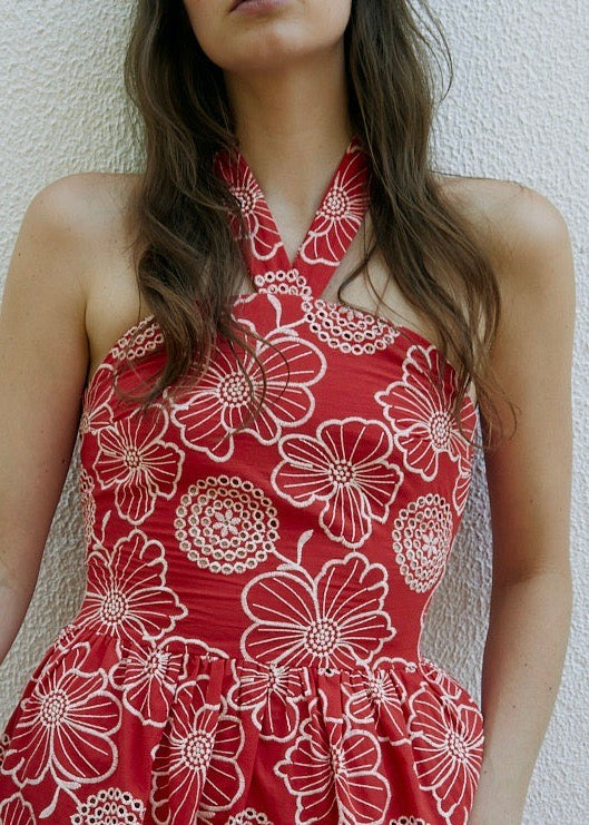 Vestido super femenino realizado en voile de algodón bordado con motivos florales. Cuerpo ajustado gracias al engomado en espalda. Lazada que sale de la parte de delante para anudar en el cuello. Falda midi con movimiento.