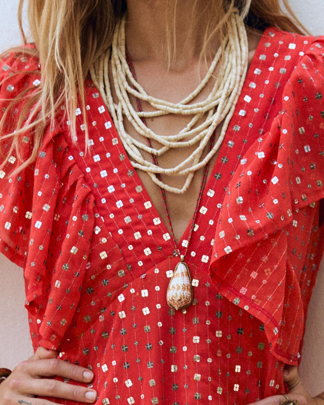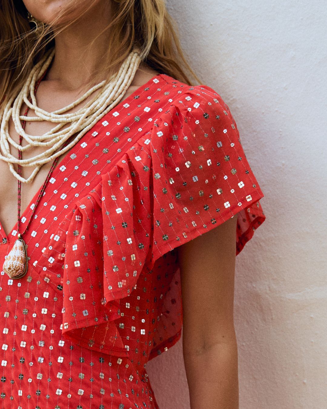 VESTIDO FLUIDO, QUE NO MARCA. REALIZADO EN GASA CON VOLANTES EN PARTE DE ARRIBA. TEJIDO CON PEQUEÑOS CRISTALES.