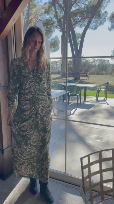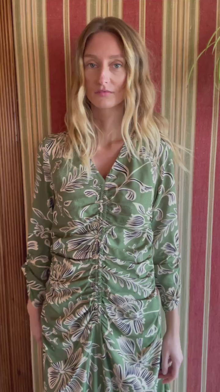 Vestido maxi, falda con movimiento, escote pico, parte de delante con frunces, manga recta con frunces.