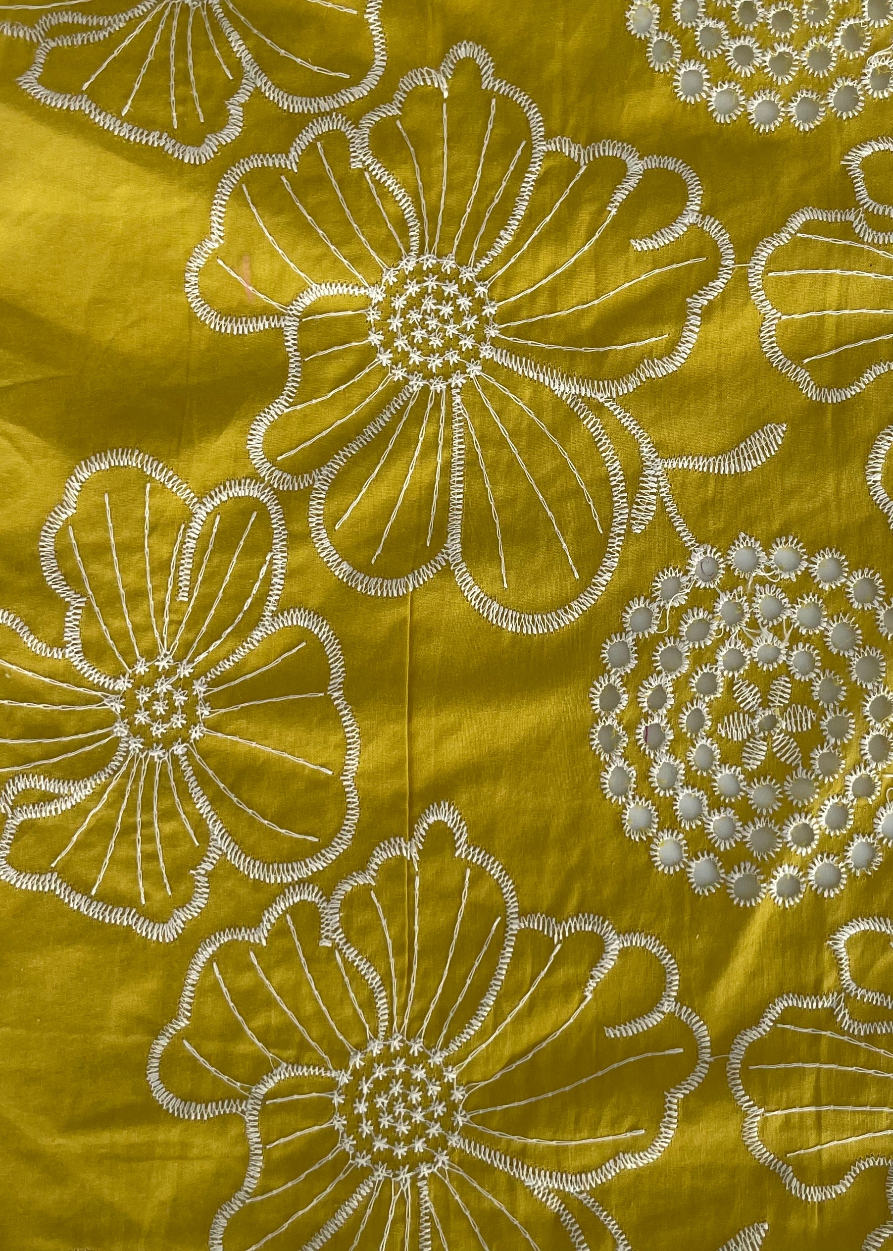 Vestido largo muy favorecedor estilo caftan. Manga larga que va estrechando. Puffy en hombros. Escote pico. Tejido en voile de algodón en tonos amarillos y bordados de flores.